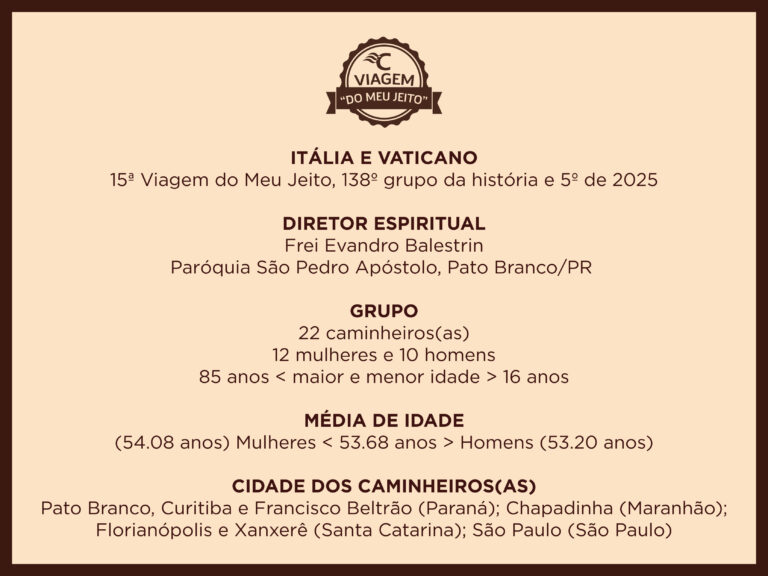 Aproveite nossa experiência de uma década operando grupos internacionais para realizar a viagem da sua organização, comunidade ou Igreja ao(s) destino(s) de vossa escolha. Chamamos este serviço de Viagem do Meu Jeito, pois personalizamos o roteiro de acordo com os gostos e condições ($) dos passageiros.