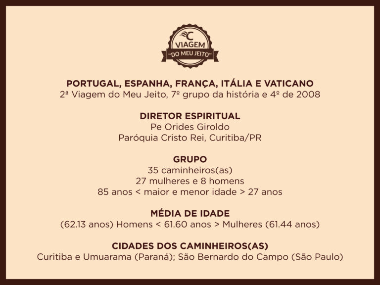 Aproveite nossa experiência de uma década operando grupos internacionais para realizar a viagem da sua organização, comunidade ou Igreja ao(s) destino(s) de vossa escolha. Chamamos este serviço de Viagem do Meu Jeito, pois personalizamos o roteiro de acordo com os gostos e condições ($) dos passageiros.