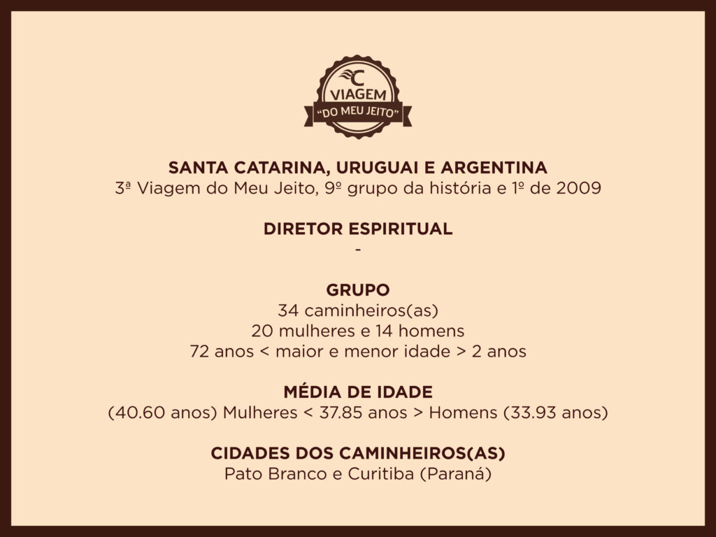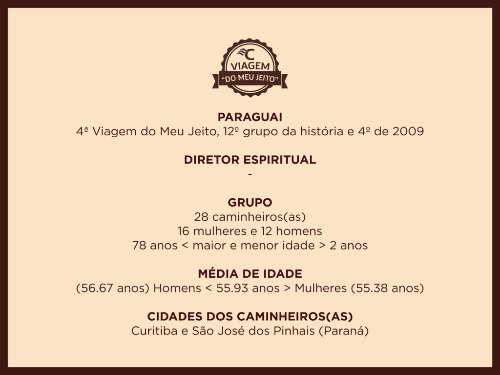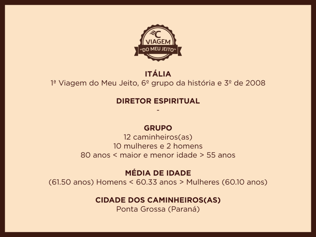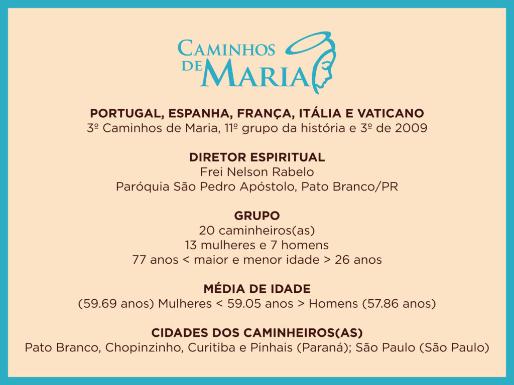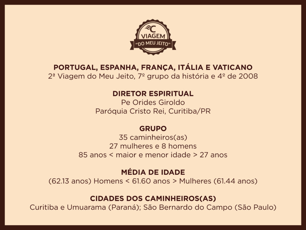 ÁlbunsNossa história contada em imagens. Todas as viagens Caminhos da ColômbiaCaminhos da FéCaminhos da LuzCaminhos de GuadalupeCaminhos de João Paulo IICaminhos de MariaCaminhos de MoisésCaminhos de São FranciscoCaminhos de São PauloCaminhos do ChileCaminhos do GolfoCaminhos do Leste EuropeuCaminhos dos BalcãsCaminhos dos IncasCaminhos IbéricosViagem do Meu JeitoSantuários Eucarísticos Italianos ÁlbumCaminhos da LuzMarço 2011 06/03/2011 a 15/03/2011Veja o álbum ÁlbumCaminhos da LuzNovembro 2010 07/11/2010 a 18/11/2010Veja o álbum ÁlbumCaminhos da FéOutubro 2010 09/10/2010 a 22/10/2010Veja o álbum ÁlbumCaminhos dos IncasSetembro 2010 10/09/2010 a 18/09/2010Veja o álbum ÁlbumCaminhos de MariaMaio 2010 10/05/2010 a 22/05/2010Veja o álbum ÁlbumCaminhos de São PauloAbril 2010 12/04/2010 a 30/04/2010Veja o álbum ÁlbumCaminhos da LuzMarço 2010 28/02/2010 a 17/03/2010Veja o álbum ÁlbumCaminhos da LuzNovembro 2009 01/11/2009 a 10/11/2009Veja o álbum ÁlbumViagem do Meu JeitoGrupo AFFIPA do Paraná 30/10/2009 a 02/11/2009Veja o álbum ÁlbumCaminhos de MariaMaio 2009 10/05/2009 a 26/05/2009Veja o álbum ÁlbumCaminhos de São PauloAbril 2009 08/04/2009 a 23/04/2009Veja o álbum ÁlbumViagem do Meu JeitoGrupo Amigos de Pato Branco/PR 30/01/2009 a 08/02/2009Veja o álbum ÁlbumCaminhos da LuzNovembro 2008 16/11/2008 a 25/11/2008Veja o álbum ÁlbumViagem do Meu JeitoGrupo Paróquia Cristo Rei (Curitiba/PR) 10/10/2008 a 20/10/2008Veja o álbum ÁlbumViagem do Meu JeitoGrupo Cultura Italiana de Ponta Grossa/PR 02/09/2008 a 22/09/2008Veja o álbum ÁlbumCaminhos de MariaMaio 2008 11/05/2008 a 26/05/2008Veja o álbum ÁlbumCaminhos da LuzMarço 2008 02/03/2008 a 11/03/2008Veja o álbum ÁlbumCaminhos de MariaOutubro 2007 08/10/2007 a 29/10/2007Veja o álbum ÁlbumCaminhos da FéMaio 2007 07/05/2007 a 28/05/2007Veja o álbum ÁlbumCaminhos da FéMaio 2006 11/05/2006 a 01/06/2006Veja o álbumAnterior 1 … 4 5 6