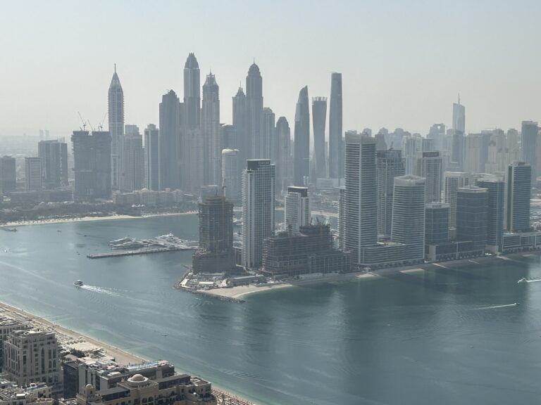 Lá subimos no 52º andar do The View, que é o maior prédio da ilha, para apreciá-la do alto. Depois seguimos até o quebra-mar construído ao seu redor para tirarmos fotos do hotel 5 estrelas Atlantis e da marina da cidade pela perspectiva do golfo pérsico (ou arábico). Depois seguimos para a própria marina, onde observamos a magnitude dos prédios construídos no entorno do canal artificial de 4km que percorre o local.