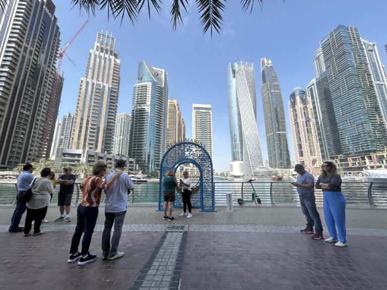 No segundo dia de atividades nos Emirados Árabes conhecemos a marina de Dubai e a região da Jumeirah, que começaram a ser expandidas no início dos anos 2000, quando a maior cidade do país se tornou um ícone do turismo mundial. Em Jumeirah, que significa “areia quente” em árabe, visitamos a incrível ilha artificial Jumeirah Palm, que foi construída na forma de uma palmeira para acrescentar mais de 70km de costa à cidade emirati.