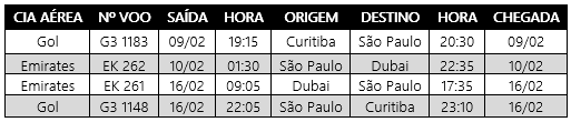 O voo da Emirates chega às 17h35min do dia 16/02 em Guarulhos e o da Gol às 23h10min em Curitiba. Qualquer mudança de horário informaremos nas mídias sociais Facebook, Instagram e Twitter. Obrigado por acompanharem mais um grupo aqui no Diário. Até o próximo 😉