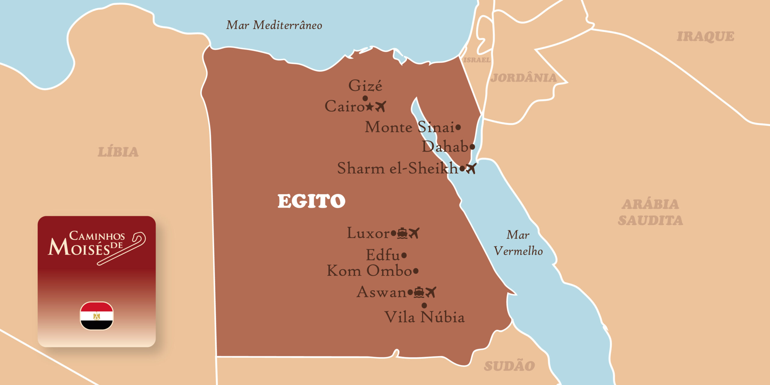 Cairo, Gizé, Aswan, Vila Núbia, Kom Ombo, Edfu, Luxor, Sharm el-Sheikh, Monte Sinai e Dahab.