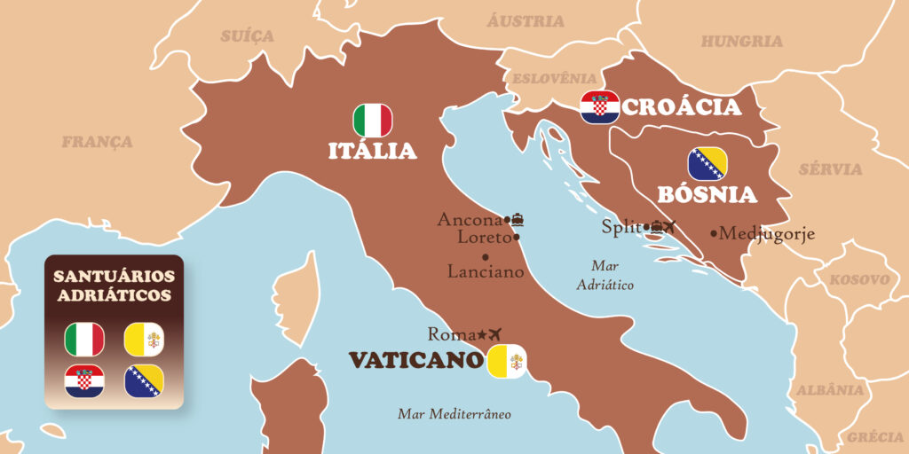 Roma com Vaticano, Lanciano, Loreto e Ancona (Itália); Split (Croácia); Medjugorje (Bósnia & Herzegovina).